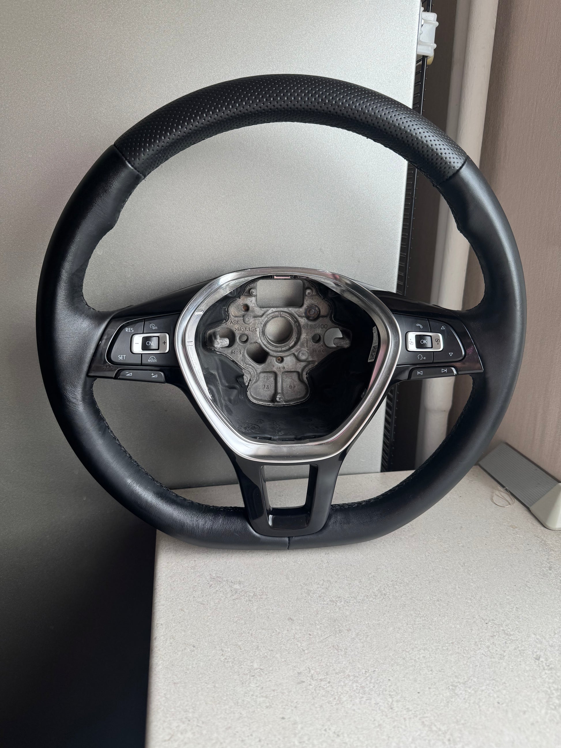 Premium klasės vairo apsiuvimas, derinantis lygią Nappa odą ir perforuotą odą viršutinėje dalyje. Toks derinys suteikia tiek estetikos, tiek funkcionalumo: lygi Nappa oda užtikrina švelnų, prabangų pojūtį rankose, o perforuota oda viršuje pagerina sukibimą ir suteikia sportišką charakterį.
